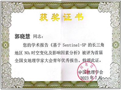 我校研究生郭晓慧、蔡宗彩参加了此次会议,并分别作了题为《基于Sentinel-5P的长三角地区NO2时空变化及影响因素分析》和《基于遥感生态指数的2000-2020年中国河口湿地生态环境质量评价》的学术报告,得到了与会专家学者的认可,其中郭晓慧同学的报告获得青年优秀报告奖(本次大会仅评选出10位青年优秀报告获奖者)。