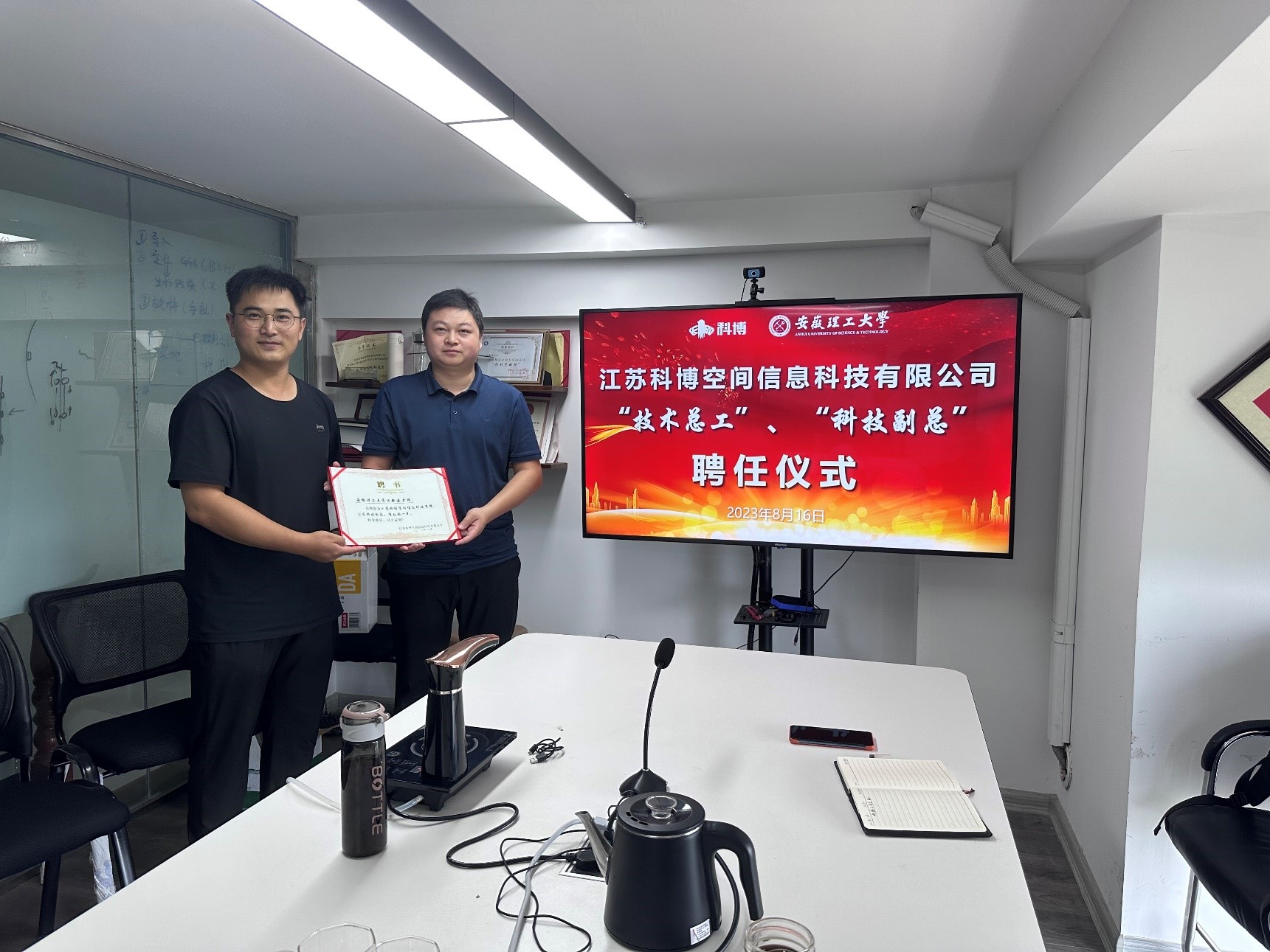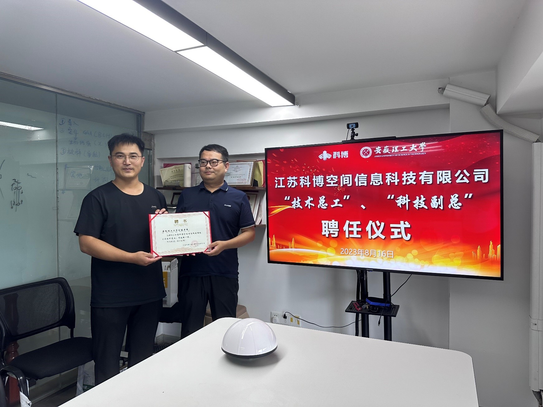 江苏科博空间信息科技有限公司技术部负责人王明明介绍了公司概括、北斗多源智能安全监测等业务,并就科技创新和岗位设置等进行了探讨。为了加强校企深度融合,促进科技协同创新,王明明为威尼斯官网青年教师颁发了企业挂职聘书。