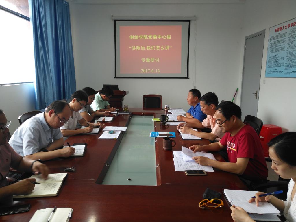 6月12日,测绘学院党委中心组在南511会议室召开“讲政治、重规矩、作表率”专题学习研讨会,围绕“讲政治,我们怎么讲”开展第一次研讨。学院党委副书记吴军(主持工作)主持会议。院党委中心组成员参加会议。