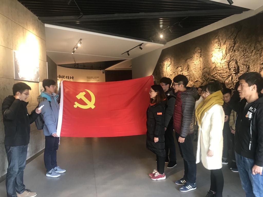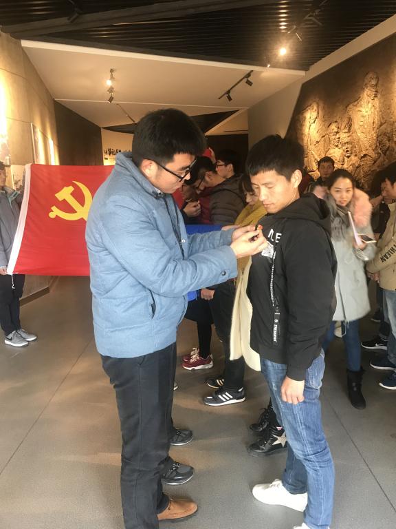 参观完后,4位新发展的党员带队,全体党员在党旗下重温了入党誓词。正式党员为新发展党员佩戴党徽。